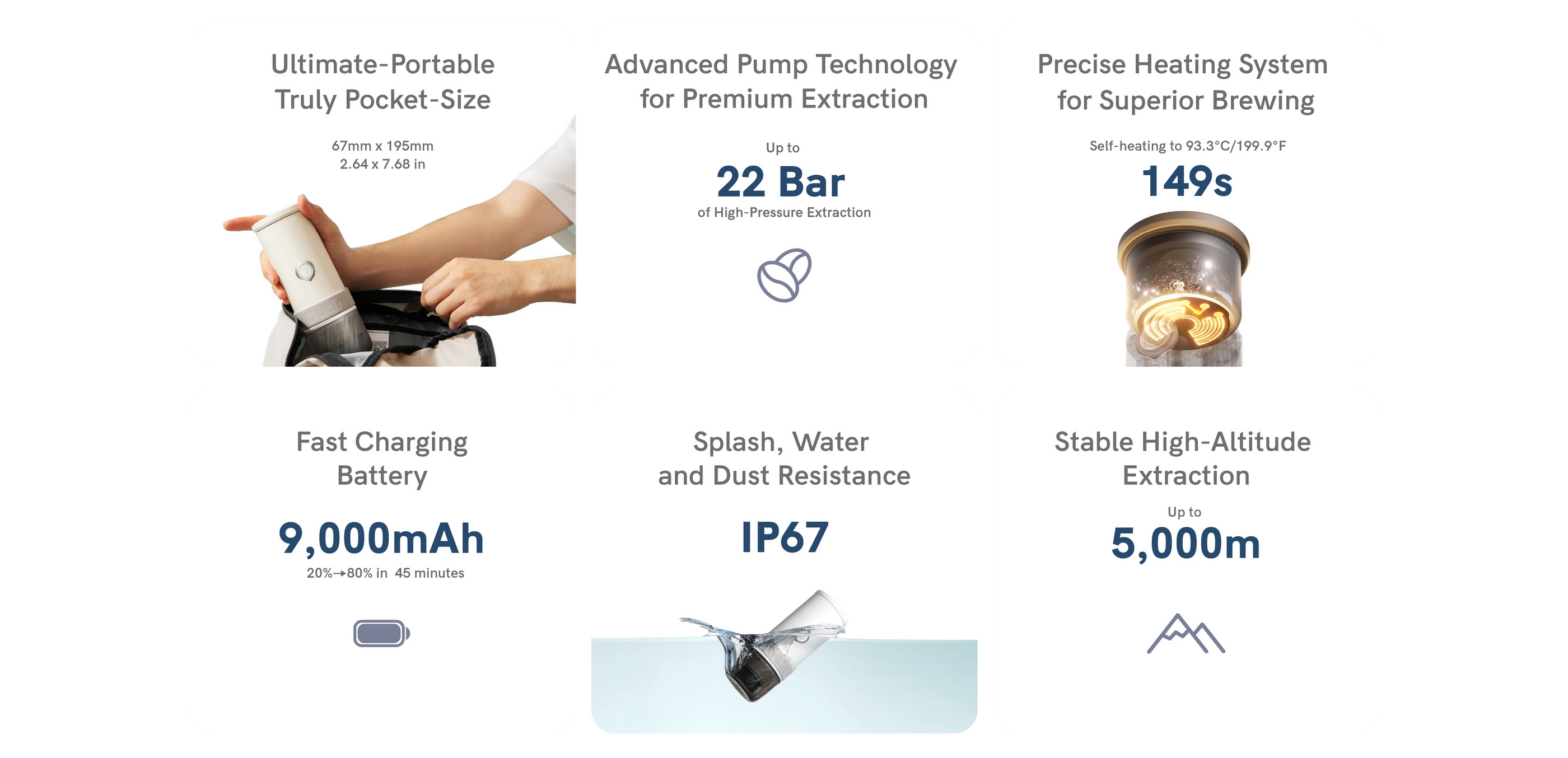 • Eventyrklart Design: Bygget til de aktive – fra hjemmet til bjergtoppe. Med IP67-beskyttelse mod vand, støv og stænk samt stabil ekstraktion op til 5.000 meters højde.